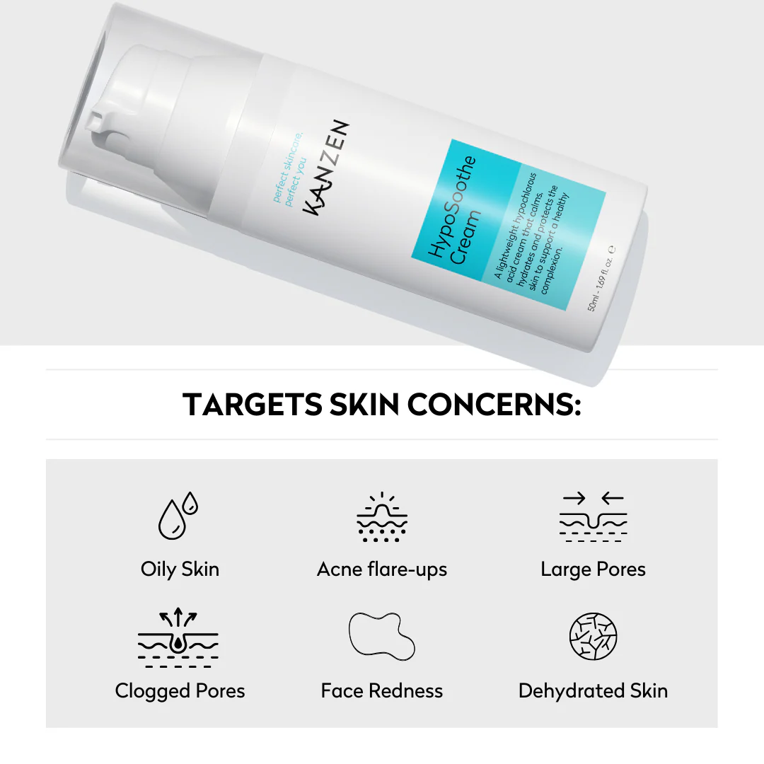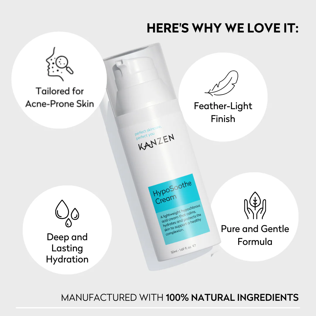 Discover the power of Hypochlorous Acid skincare with Kanzen HypoSoothe – a next-generation moisturiser clinically formulated to soothe, hydrate, and restore irritated or compromised skin. At the heart of this formula is pure Hypochlorous Acid (HOCl), a naturally occurring molecule known for its powerful antimicrobial and anti-inflammatory properties. Backed by advanced barrier-repair ingredients, HypoSoothe is ideal for sensitive skin, acne-prone skin, and post-treatment recovery.