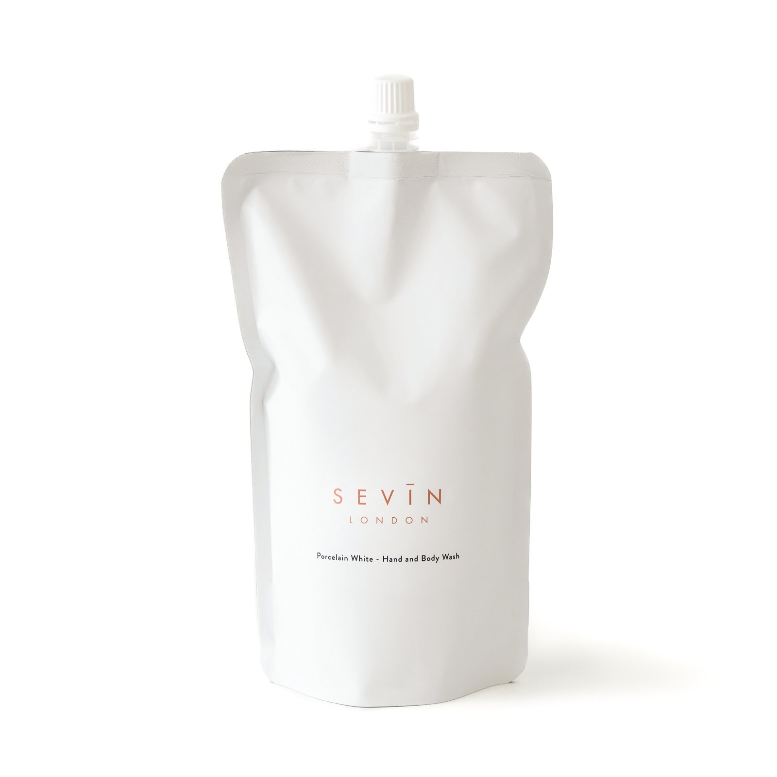 Pour the wash into your S E V I N London bottle, apply it to your hands and body, gently massage into damp skin, and rinse thoroughly. Once finished, recycle the pouch and follow with an application of Porcelain White Hand & Body Lotion for soft, nourished skin.
